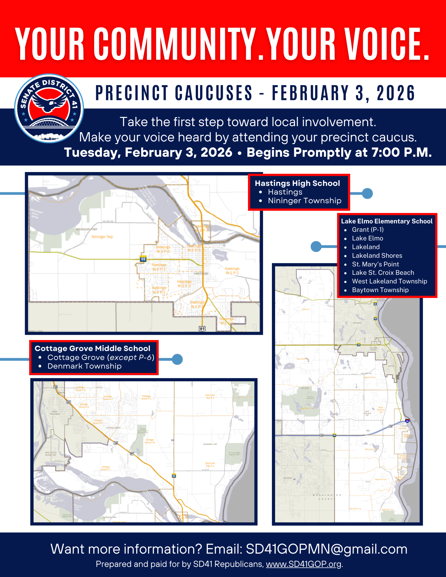 Senate District 41 encompasses portions of Washington and Dakota Counties, including the communities of Cottage Grove, Hastings, Afton, Lake Elmo, Lakeland, Lakeland Shores, Lake St. Croix Beach, St. Mary’s Point, as well as the townships of Denmark, Nininger, and Grant.